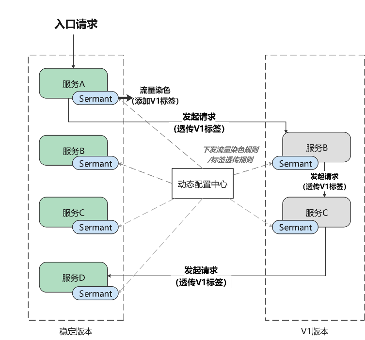 Sermant的流量染色、流量标签透传、标签路由能力使得Sermant具备了完整的全链灰度发布的能力。并且染色、透传、路由规则都支持动态配置,让全链灰度发布可以按照实际场景的需求来进行开关或调整治理规则。
