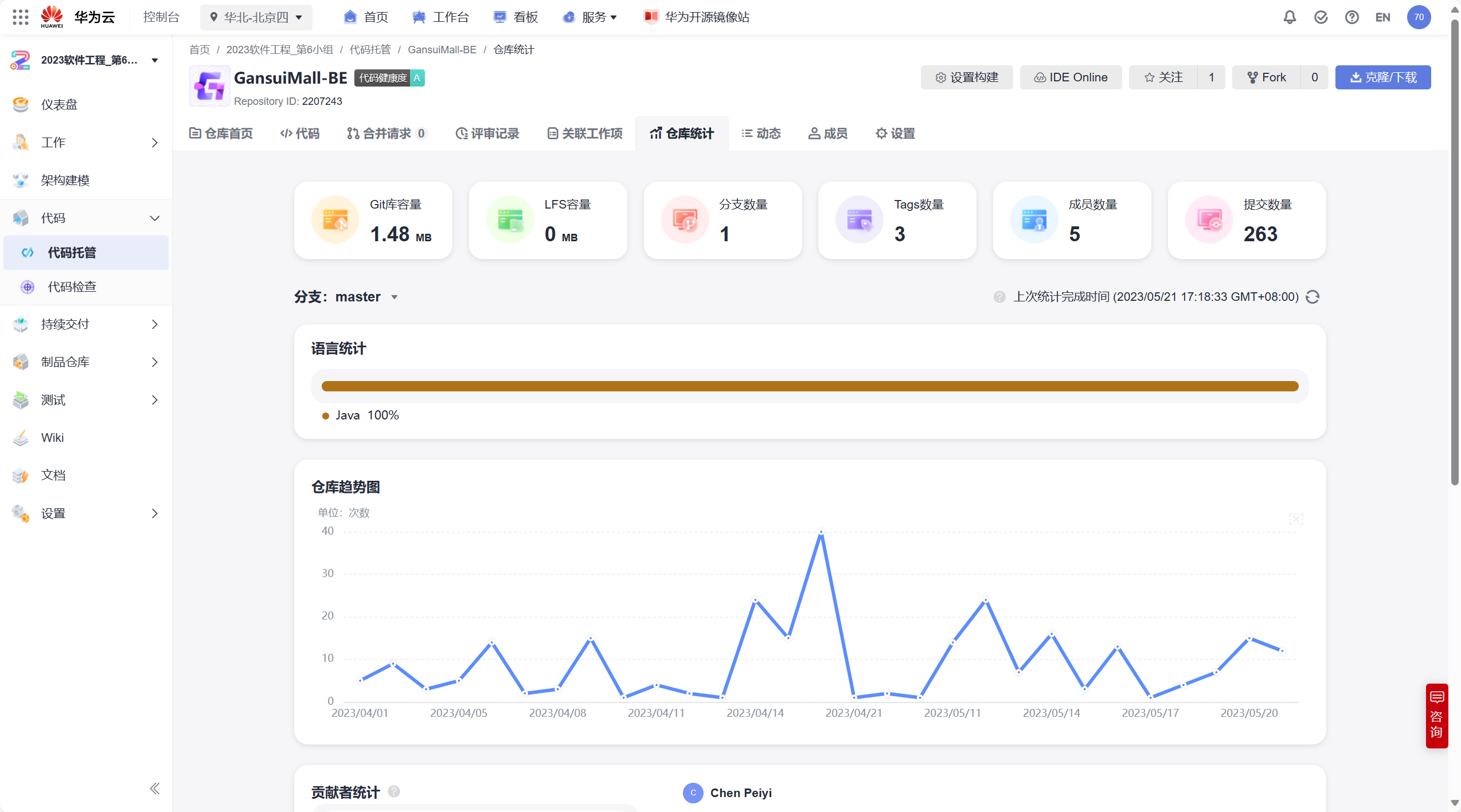 支持查看代码仓库的统计信息,如代码容量、commit次数等,以观察团队成员合作情况。