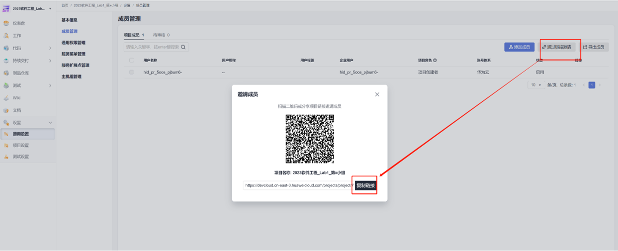 组长注册并开通【基础版DevCloud】,新建【Scrum】项目,通过链接邀请组员进入同一小组。