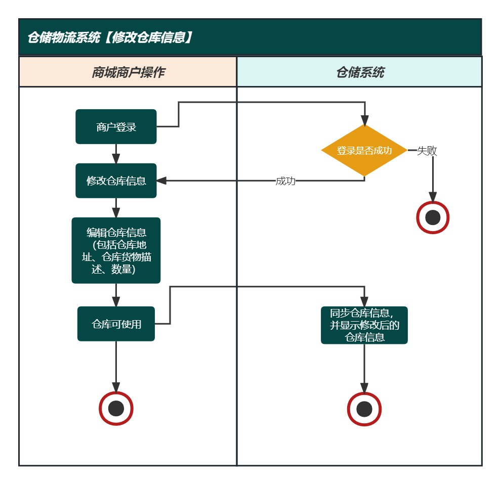 • 目标:在仓储物流系统中修改已存在的仓库信息,以更新仓库的相关属性和细节。