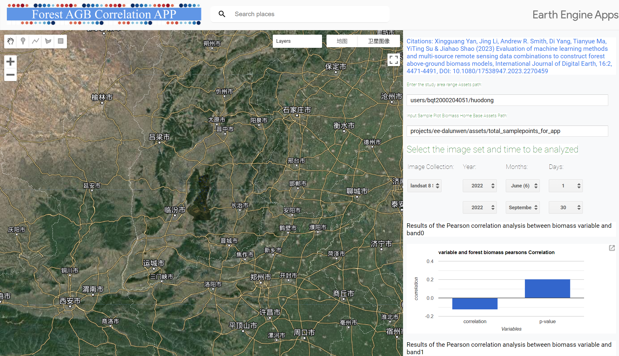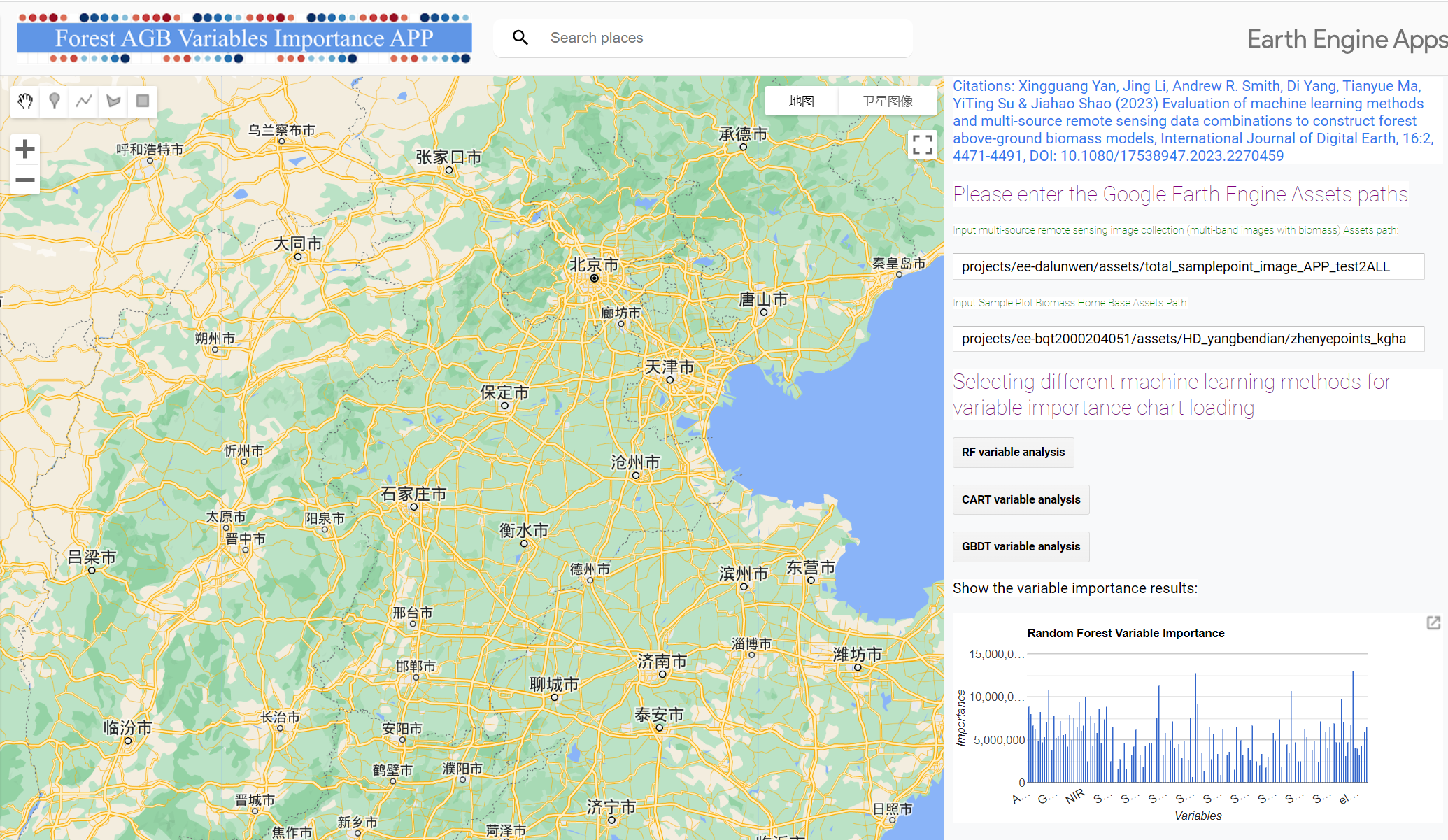 数百个变量的相关性分析结果包括相关系数和 p 值。森林生物量和变量重要性分析应用程序根据多源遥感变量和森林生物量进行变量重要性分析,并根据变量重要性结果选择多源遥感变量建立模型,变量重要性分析中提供了 RF、CART 和 GBDT ML 方法。森林生物量预测应用程序以上述应用程序为基础,但对其进行了扩展,允许用户使用本分析中使用的 30 种多源变量组合选择不同的 ML 方法进行生物量模型预测,并可在线比较森林 AGB 估计值和准确性(即 R2、RMSE、MAE 和 RE)的评估结果。