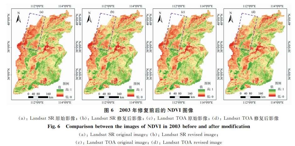 为了验证影像修复前后对于山西省 34 年间 NDVI的影响,分别对影像修复前后的NDVI值进行时序分析,如图5所示。元线性回归的趋势性分析结果表明:Landsat TOA影像修复后的NDVI值斜率为0.0062小于影像修复前,拟合度R2为0.810 6高于修复前;Landsat SR影像修复前的NDVI 斜率为 0.007 1,而修复后的斜率为 0.006 7,且拟合优度R2值0.8363大于修复前的0.829 3,表明影像修复后的拟合度更高。整体上看Landsat影像修复后的结果在长时间序列的变化波动性更小,趋势更加平滑。修复后的Lansat SR影像比Laodsat TOA影像提升幅度更明显。