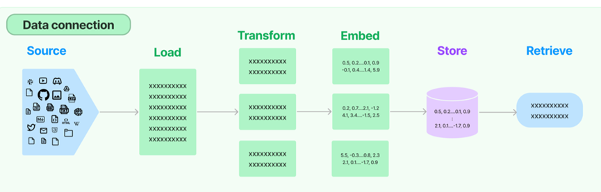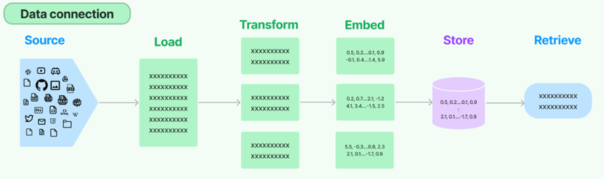 - Data connection:管理主要用于建设私域知识(库)的向量数据存储(Vector Stores)、内容数据获取(Document Loaders)和转化(Transformers),以及向量数据查询(Retrievers)
