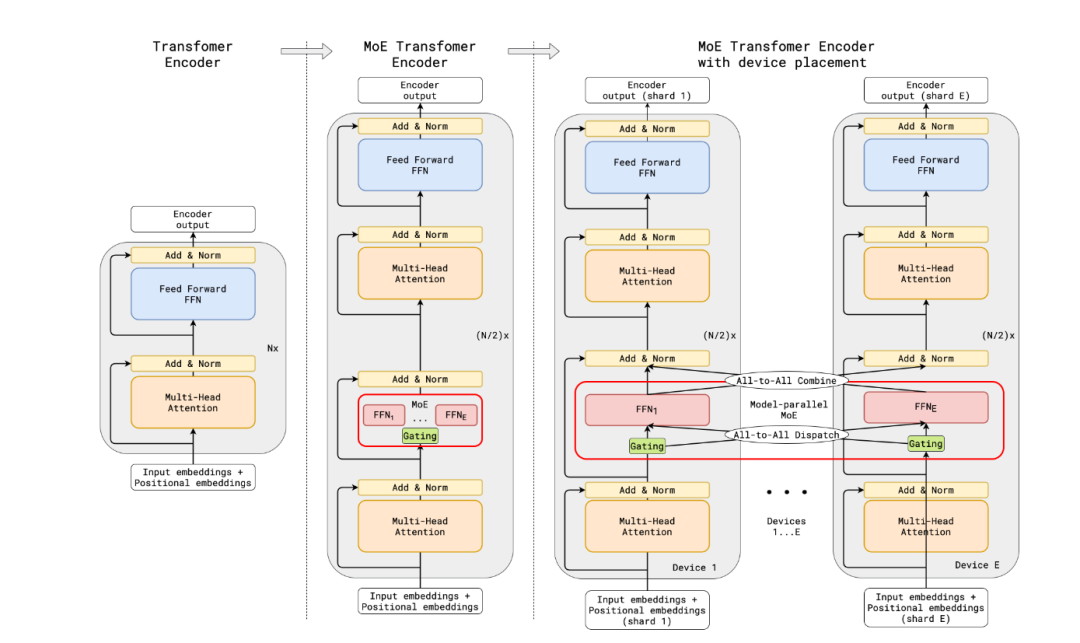 Gshard的论文最早于2020.6.30发表(Gshard Scaling Giant Models with Conditional),Transformer的encoder和decoder中,每隔一个(every other)FFN层,替换成position-wise MoE层。