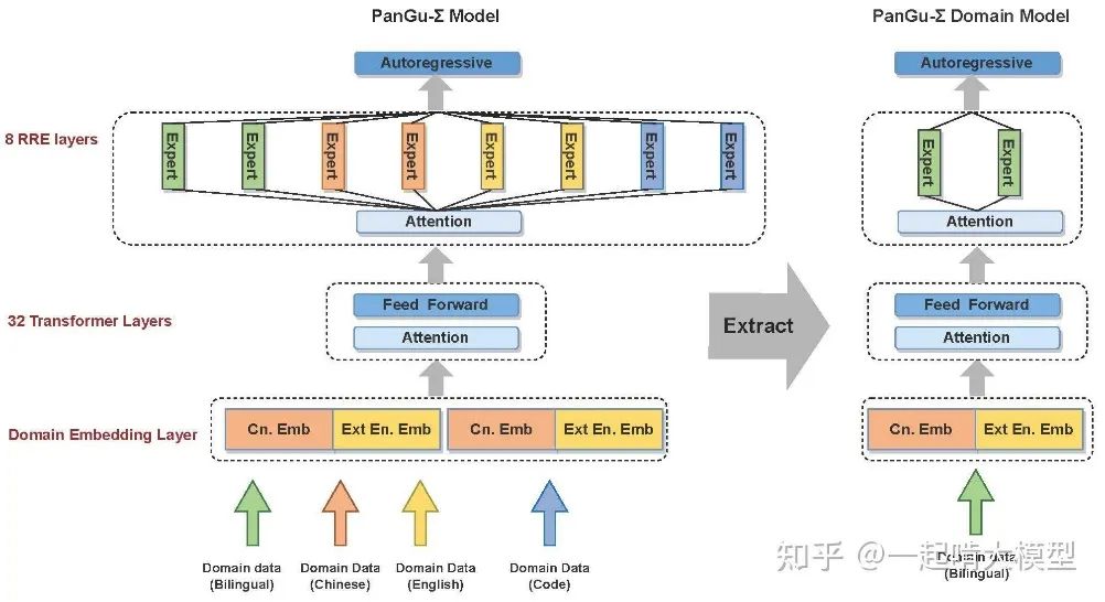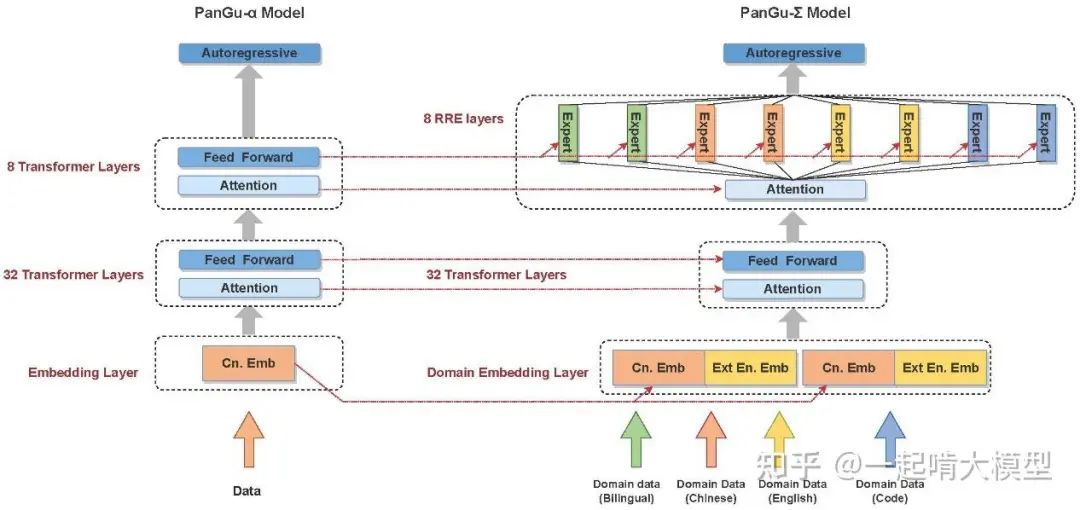 Pangu-sigma[8]是今年3月华为诺亚方舟实验室基于Pangu-alpha模型进行MoE扩充实现的Lifelong-MoE模型。其提出了随机路由专家(RRE)方法,使得Gating Network也可以随着Expert进行裁剪。下图是PanGu-Sigma的示意图: