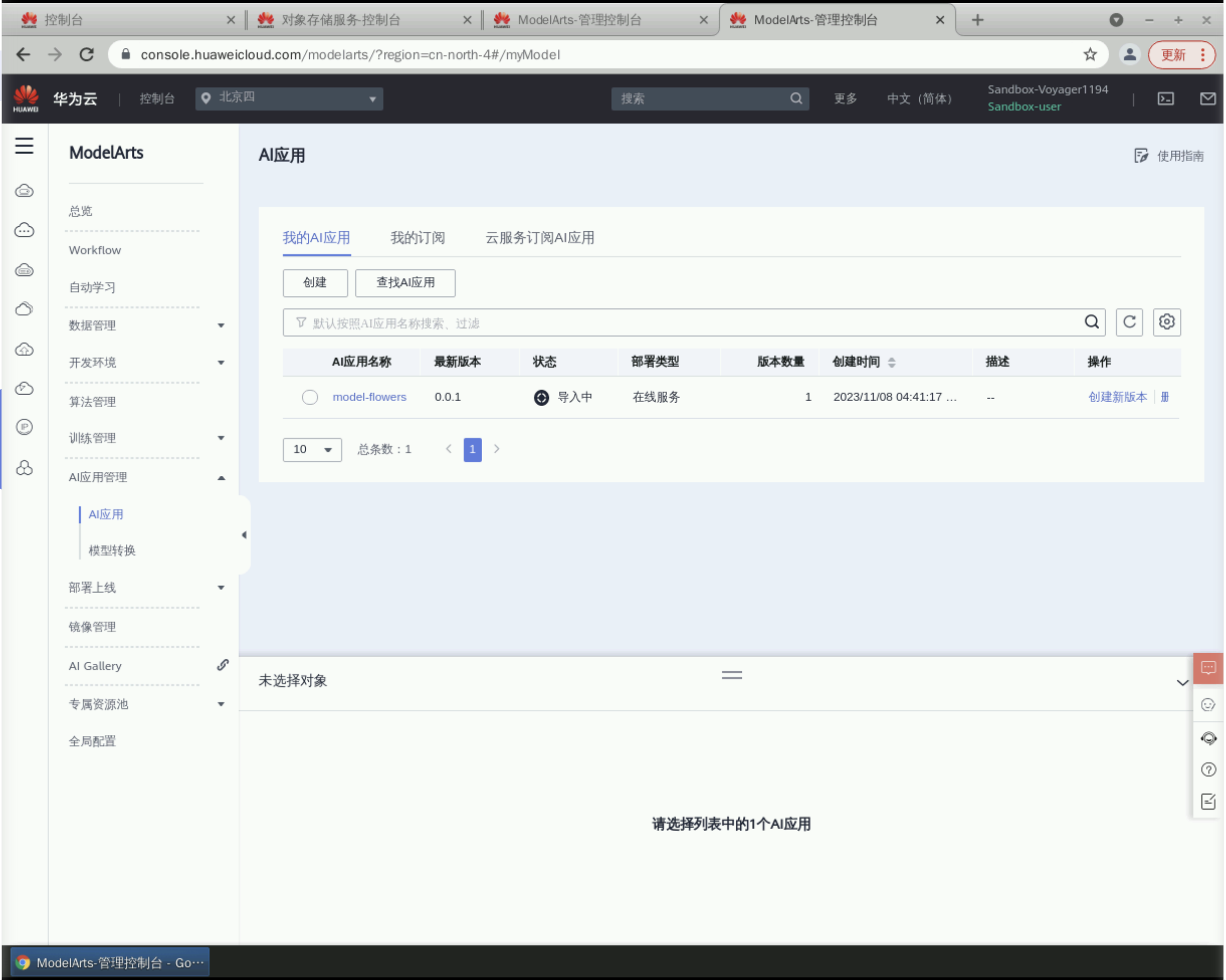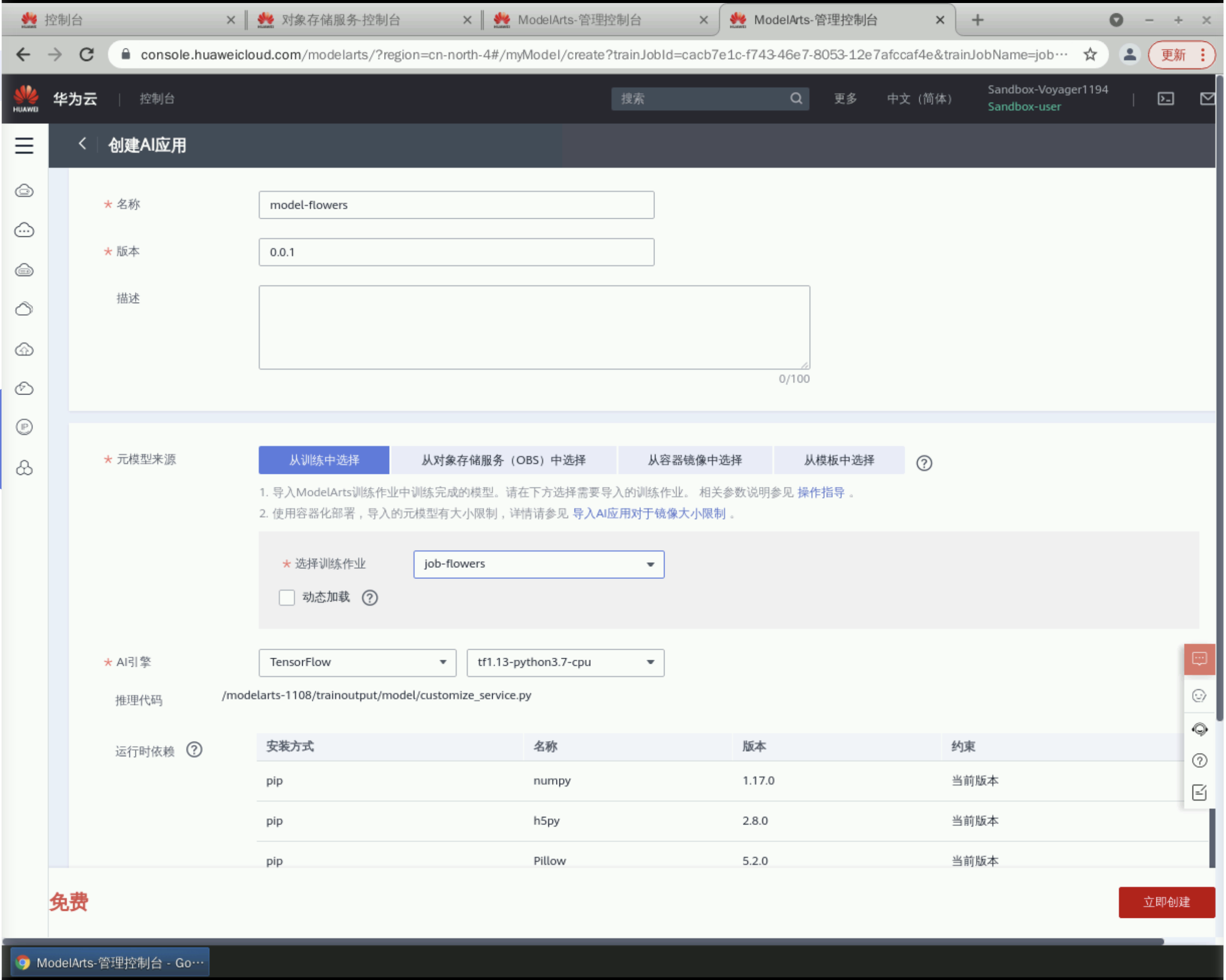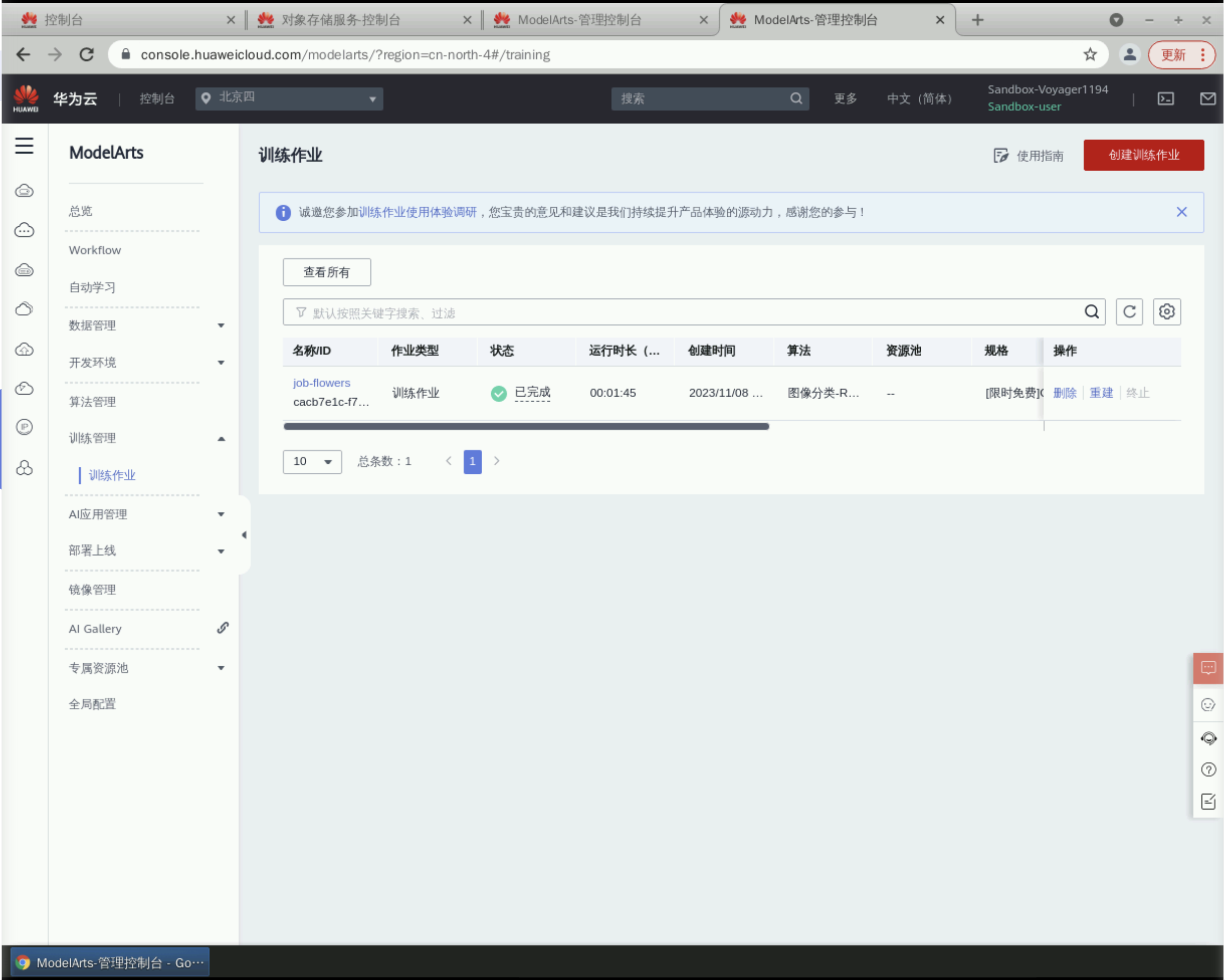 【摘要】 ModelArts是华为云提供的面向AI开发者的一站式开发平台,有数据集管理、丰富算法框架、模型管理、训练管理、在线服务、资源管理、作业监控等核心特征。通过GUI和SDK为AI开发者提供了全面、易用的平台,极大降低了AI项目的开发门槛,使得开发者可以更加专注于模型和算法。 实验过程 1 准备数据创建对象存储 obs创建文件夹,存放数据集的输入及输出下载数据集 2 训练模型使用训练集对预置的R...