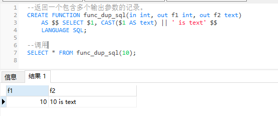 函数体内部使用 $$ 标记代码块,里面是一个SELECT语句,它返回输入参数$1的两个不同形式的值。对于f1,它直接返回输入的整数值。对于f2,它将输入的整数值转换为一个文本字符串,并在其后添加字符串' is text'。这个转换是使用CAST函数完成的,它将$1从整数值转换为文本字符串。