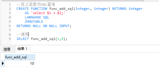 • “'select $1 + $2;'”:这是函数的主体。$1和$2是参数引用,分别代表输入的两个参数。