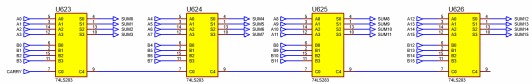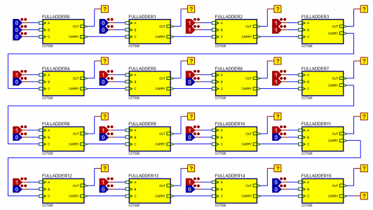 为了构建一个 16 位全加器, 我们需要将 16 个一位全加器串联在一起。对于第 i 个全 加器(0 <= i <= 15), 其输入是 Ai 、Bi 以及来自第 (i-1) 个全加器的进位输出 Cout,i − 1 (对于第 0 个全加器, Cout, − 1 通常设为 0),其输出是 Sumi 和 Cout,i。所以, 我们可以得到:
