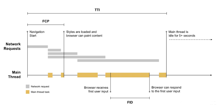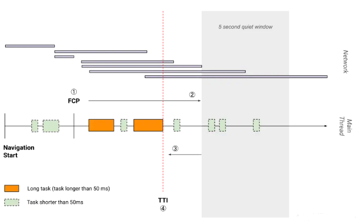 “达到可稳定交互的时间”,假如你不做任何输入,让应用自己打开,知道整个应用没有发生任何动作(静默状态)持续5秒钟,那么在这5秒钟之前的那一次长任务的结束时间,就是TTI。下图中黄条是长任务,和FID示意图中的黄条意思相同。当加载达到稳定静默状态(没有黄条)5秒钟后,往前找到最后一个长任务的结束时间,这个时间就是TTI。