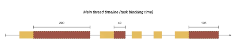 “总阻塞时长”,长任务执行会阻塞界面的渲染,有的卡顿明显,有的不明显,在FCP到TTI之间,这些长任务的阻塞时长的总和,就是TBT。下图中黄红块就是长任务,红色就是阻塞时长,红色部分的总和就是TBT