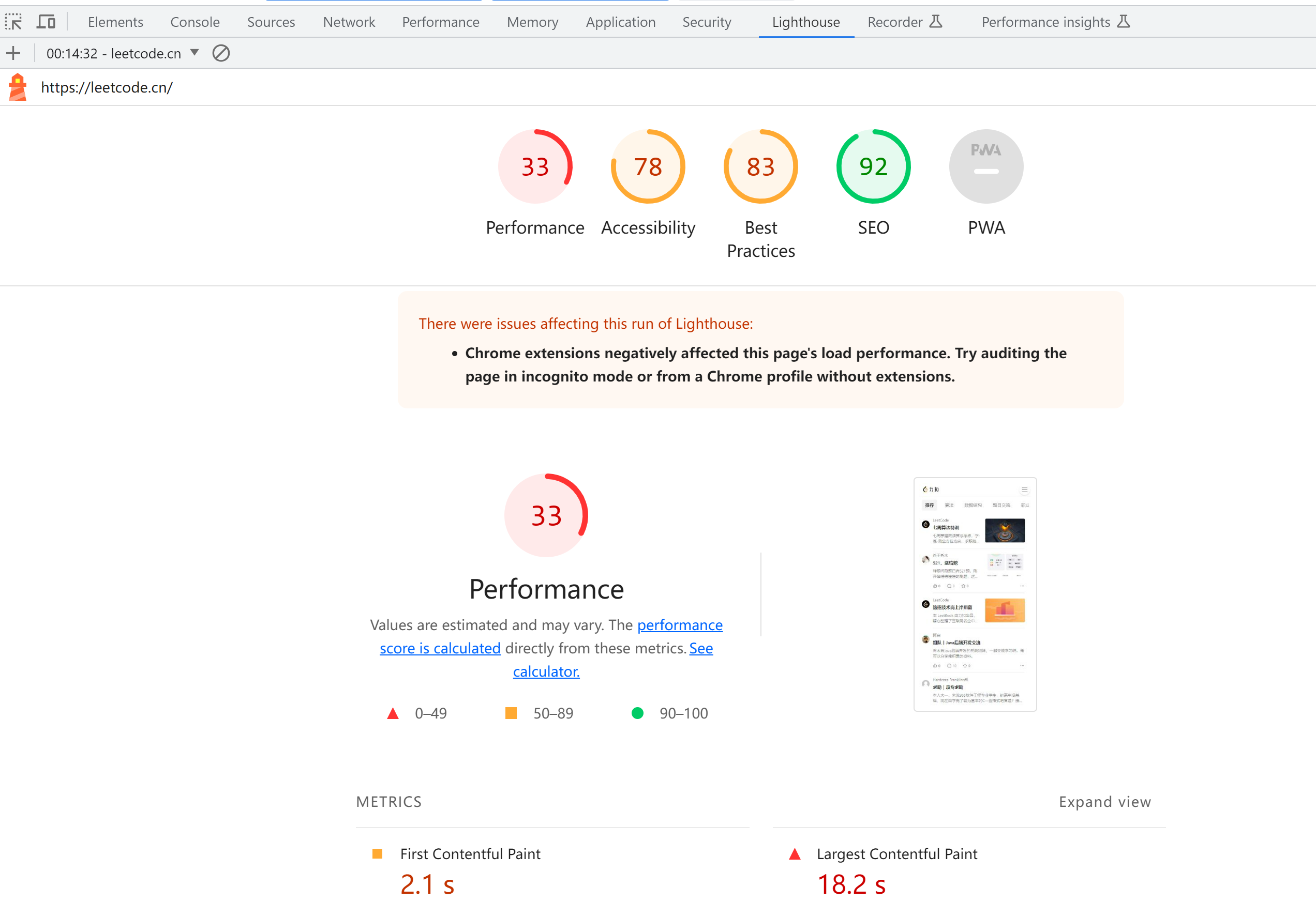 (2)Lighthouse则是一个基于谷歌评价指标的全站评测工具,其中不仅包含了性能指标,还包含了其他指标,我们可以只关注其中的性能指标,通过lighthouse,我们可以获得对自己网站的一份评测报告。