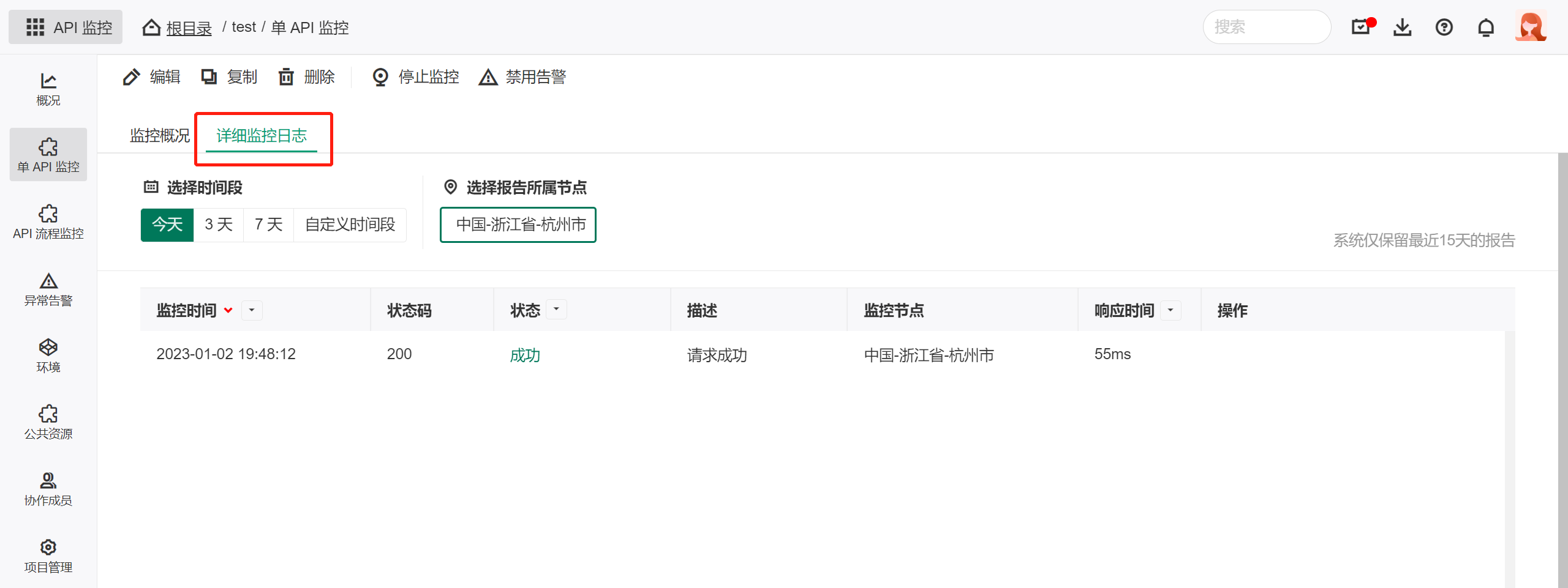 注意,系统仅会记录异常的监控日志,并且线上产品的异常监控日志最长保存日期为15天。