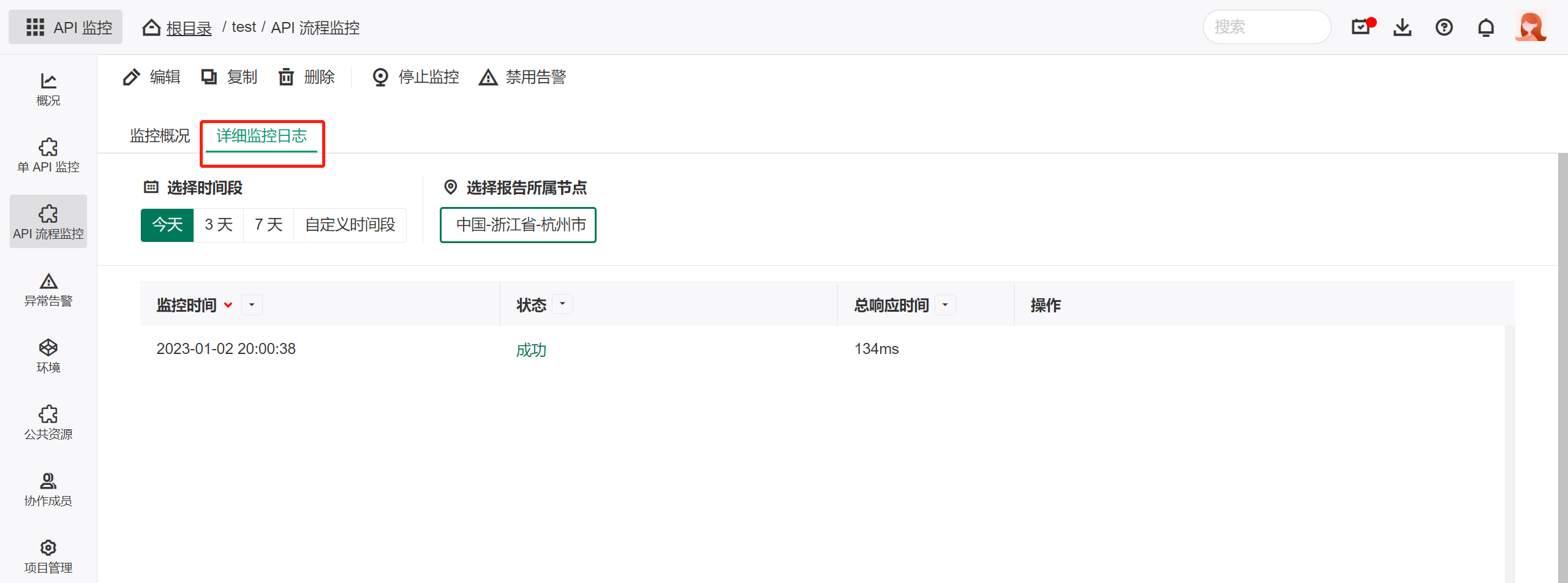 进入 API 监控详情页,点击页面上方的详细监控日志标签。进入监控日志标签页后,你可以查看选择需要查看的时间段、日志所属的节点。