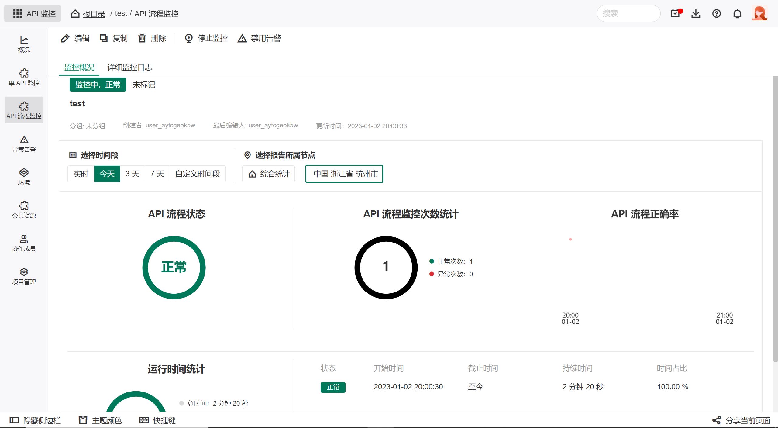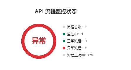 流程监控状态图表会显示当前项目内的API流程总数、监控中的流程数量、正常流程、异常流程以及整体流程正确率数据。