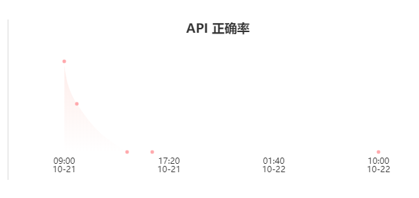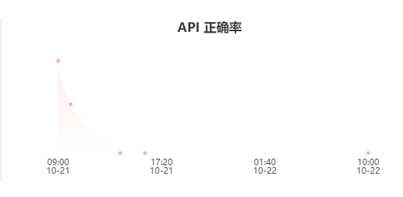 API 正确率趋势图会显示在选中时间段内的API正确率趋势,正确率趋势最小统计单位是小时,也就是一天最多会显示24个统计点;当选择的时间段大于1天时,正确率的统计点为一天,即一天统计一次正确率。