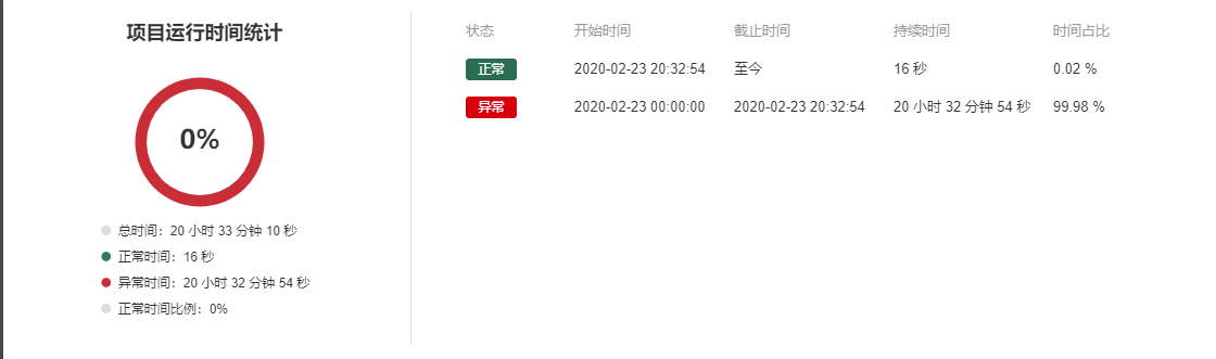 如下图表示项目在2020年2月23日凌晨0点起至2020年2月23日晚20点32分54秒处于异常状态,随后项目恢复正常。