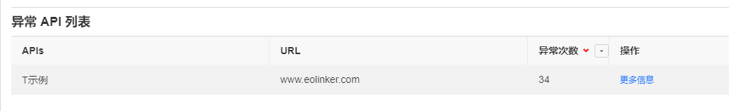 系统会统计在选定时间内出现过异常的 API,你可以通过异常 API 列表快速定位异常的 API,并且根据异常次数排序来找到异常次数最多的 API。