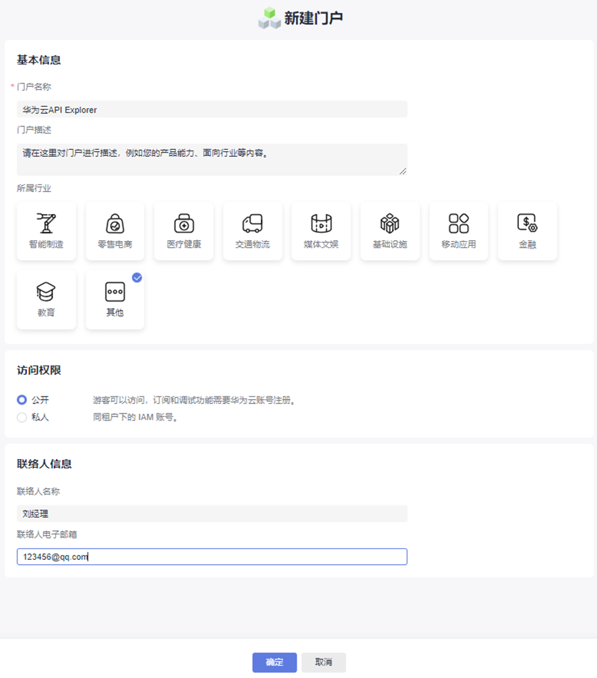 企业可通过创建和编辑API门户信息,快速实现API门户上线。企业管理者可以通过设置门户公开/私人的访问权限,来保证API门户开放程度。企业开发者可以通过门户名称、所属行业等信息搜索查找到企业API门户,并通过预留的联系人信息与企业建立联系。
