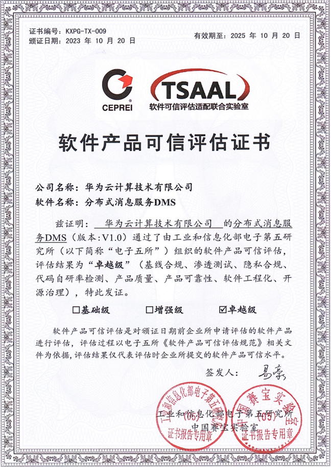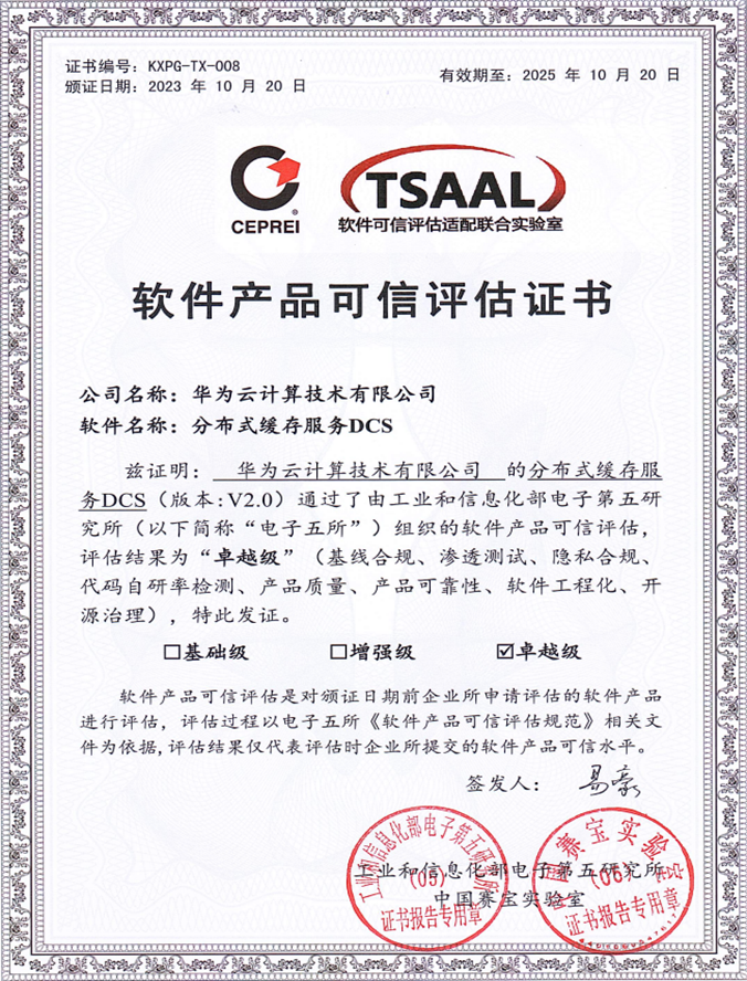 国内首批!华为云云原生中间件DCS&DMS获软件可信“卓越级”认证