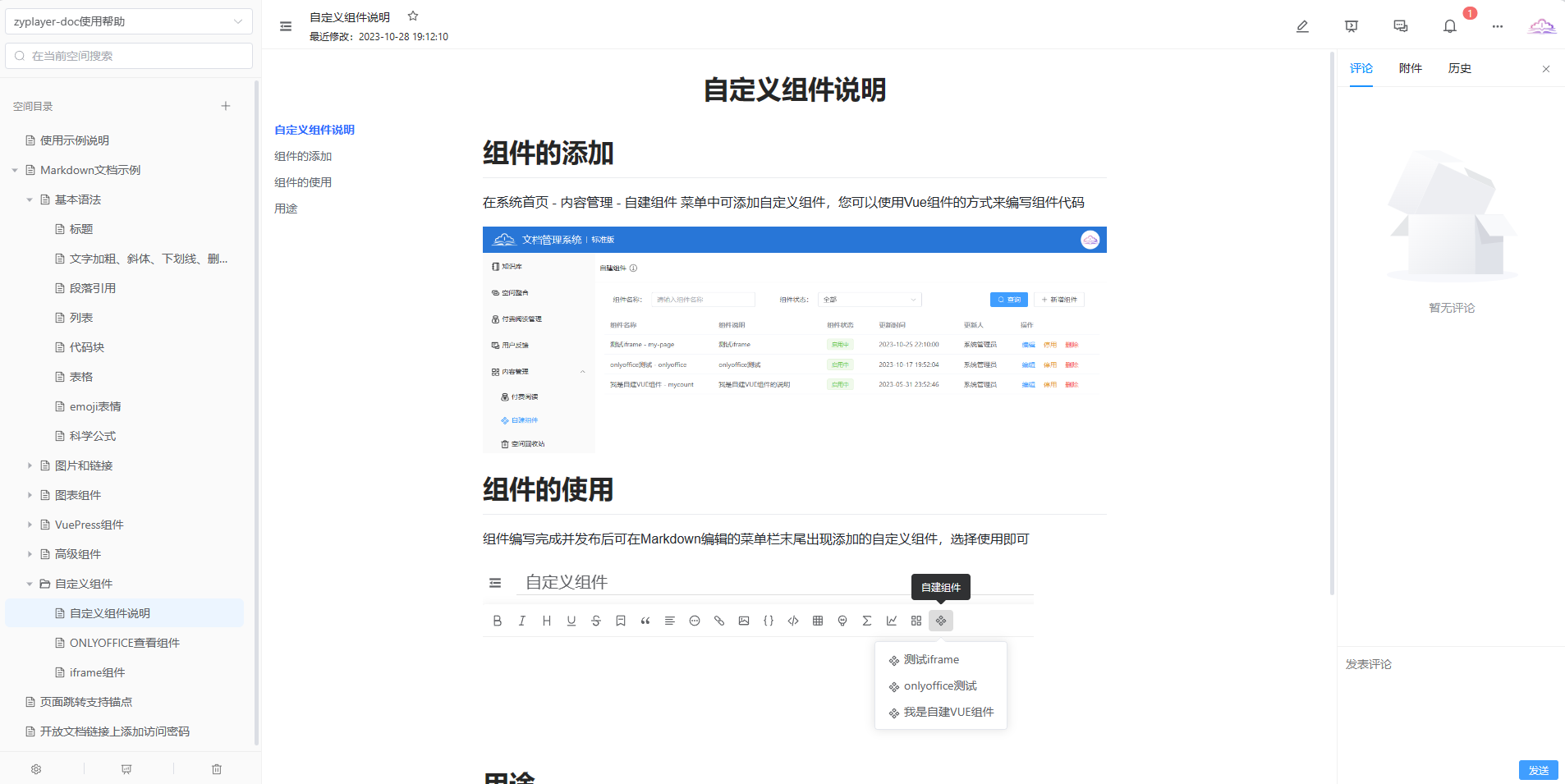 全屏演示功能可在内部投屏讲解时使用,文档更聚焦,文字也做了更大字号的显示。评论功能可对文档整体进行评论、发表意见,附件管理页可上传任意格式的文件,便于相关资源的分享与下载,历史管理页可查看每次保存的文档记录,也可查看或回滚指定的历史记录,便于文档的追溯和还原。