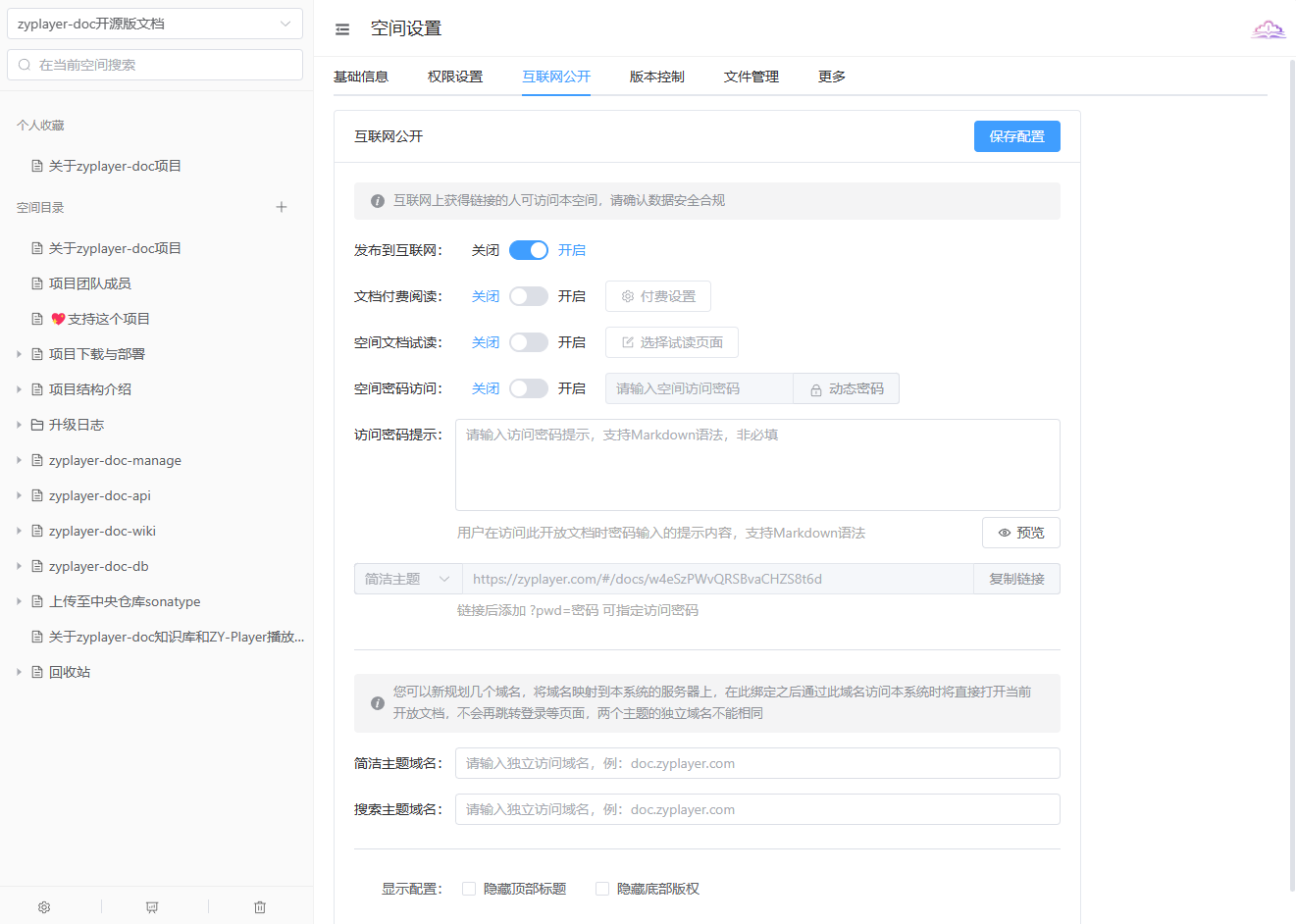 2、支持一键将空间、文集开放至互联网可访问,可设置独立的文档查看域名
