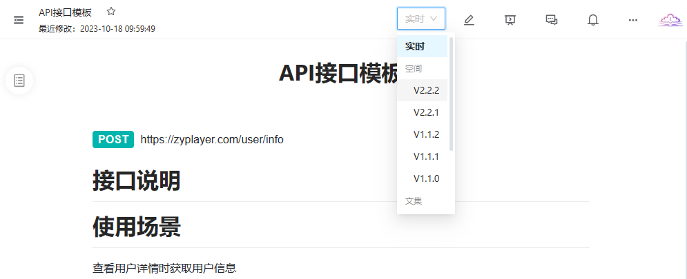 在空间设置页可开启版本控制功能,每完成一个版本文档的编写即可手动创建一个版本,各版本内的文档均可独立管理,用户在查看开放文档时也可在右上角切换版本查看对应版本的文档。