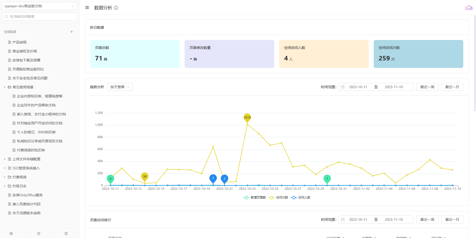 支持文档访问数据统计,有昨日数据、访问趋势分析、页面访问排行、活跃用户排行等一系列统计分析功能。