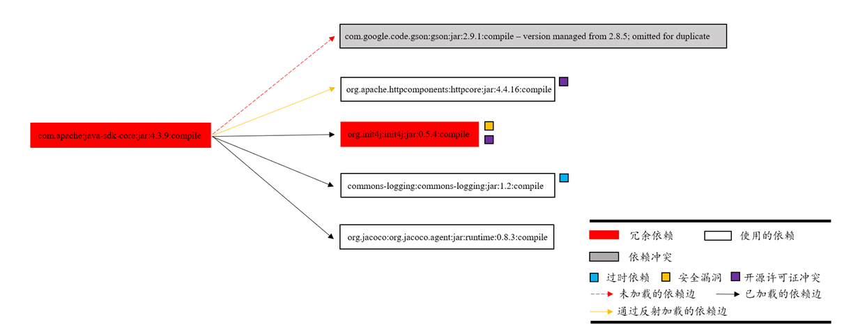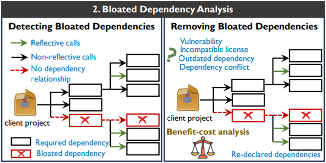 由于构建工具对软件库的自动化配置管理,使得现代软件项目在版本演化的过程中,引入大量的第三方软件库,依赖树结构日益臃肿。然而,实际上很多引入的软件库并未被真正使用。臃肿的依赖在资源受限的设备上将严重影响代码的性能、增加安全攻击面、降低软件构建效率,并对依赖管理增加额外负担。现有技术在去除冗余依赖方面存在如下问题:(a) 冗余依赖的误报。由于静态分析技术的局限性,不能良好地处理Java反射,导致冗余依赖检测的误报。(b) 去除冗余依赖可能会带来新的依赖管理问题。例如,被冗余依赖传递性引入的软件库可能会被客户端代码所间接调用。如果从配置文件中去除冗余依赖,则需要要把被其引用的传递依赖重新声明为客户端软件的直接依赖,以确保程序正确运行。这样修复后,开发人员将需要花费更多的代价来维护新增依赖的版本。为此,工业界亟需一种安全可靠的技术能够帮助开发者从依赖配置中去除冗余的第三方软件库。