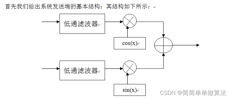 两路信号(I为上面一路,Q为下面一路)通过低通成形滤波器后与cos,sin相乘完成系统的调制,然后将两路调制信号相加完成混频,再发送出去。
