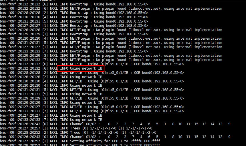 分别在各个节点上运行自己的 trains.sh 脚本,显示如下内容说明NCCL使用了IB网卡进行数据传输