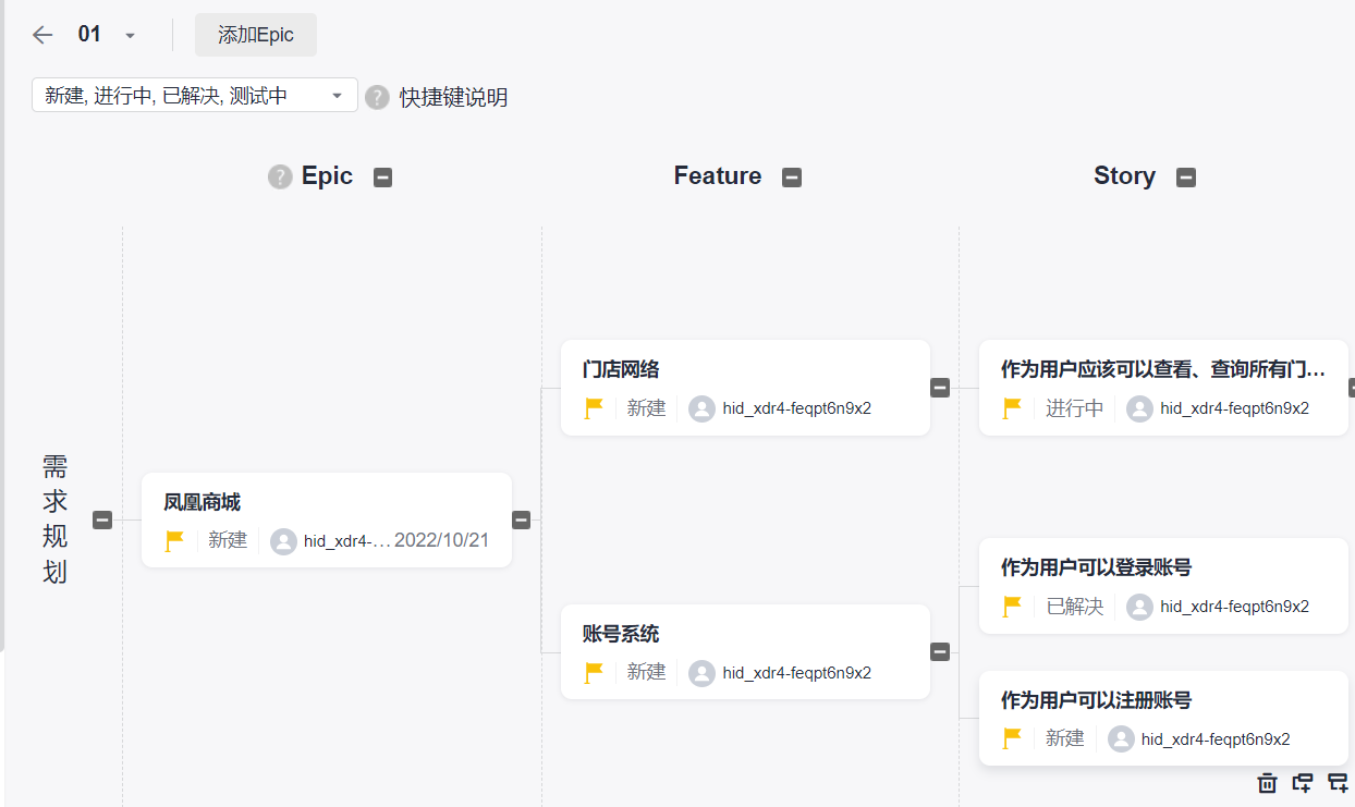 Epic 和 Feature基于树形结构列出需求"Epic> Feature> Story> Task"的逐级关系,如图2-1。
