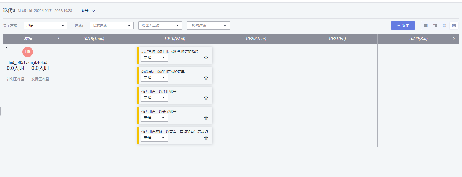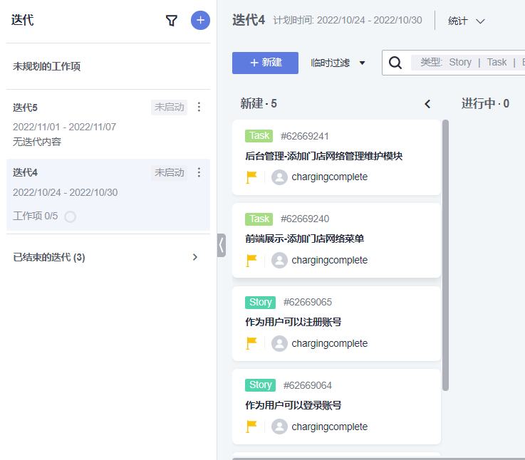 迭代规划。接下来我们需要对当前迭代(近两周)的工作进行规划,其中最重要的工作"作为用户应该可以查看、查询所有门店网络"需要在本迭代完成并上线。在迭代页面,单击"未规划工作项",找到 Story"作为用户应该可以查看、查询所有门店网络",鼠标拖拽工作项至"迭代 4"。单击"迭代 4"的"作为用户应该可以查看、查询所有门店网络",可以设置 Story 的预计开始日期与预计结束日期。 按照同样的方式,添加以下两个Story 添加至迭代 4:作为用户可以登录账号;作为用户可以注册账号。