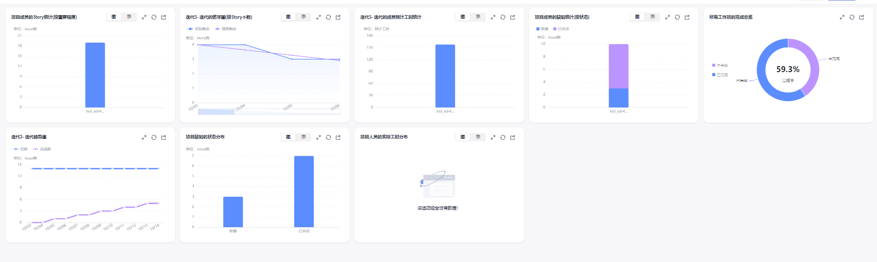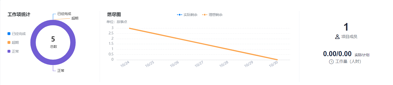项目仪表盘提供了强大的项目进度跟进能力、包括需求进度统计、燃尽图、工作完成度、工时统计等等。