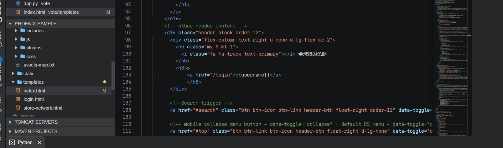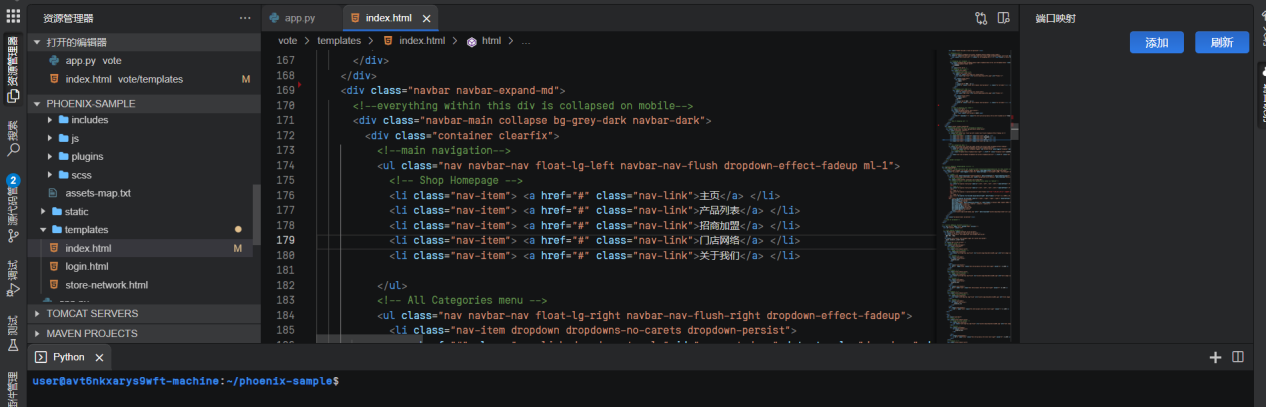修改代码。等待CloudIDE加载完毕后,在左侧导航中找到前端界面代码文件"/vote/templates/index.html"并打开,在179行添加菜单"门店网络"。