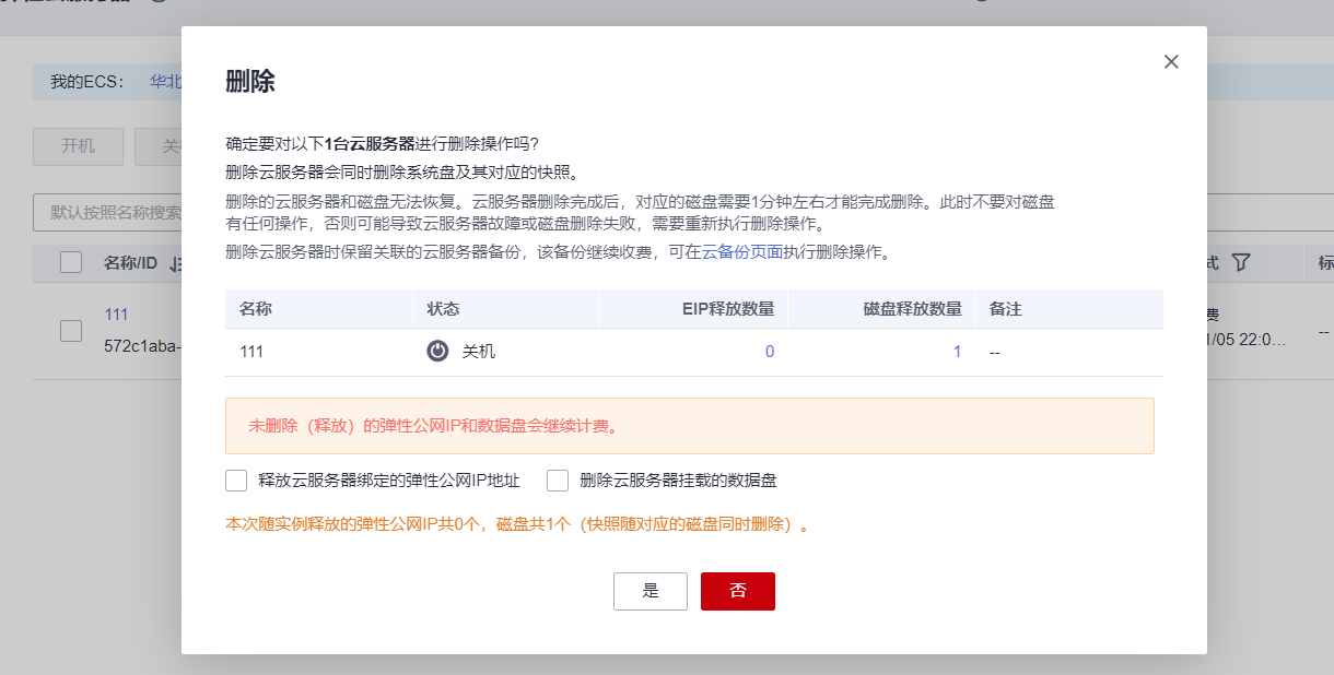 为了避免不必要的费用,如果您在项目课程实践完成后,无需再使用这些资源,建议您参考以下操作释放弹性云服务器资源。