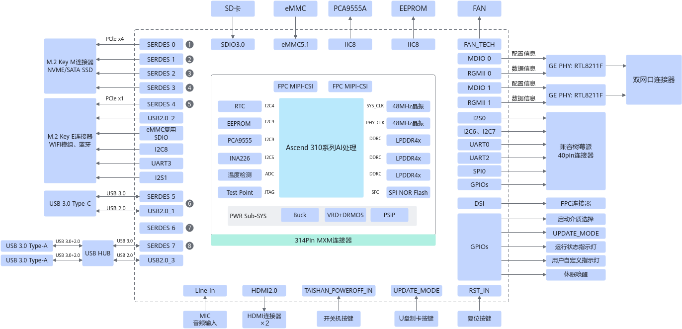 在ROS研究中,我们在入门基础除了ROS的小乌龟外,在通信层次我们也需要了解一些串口通信,在Atlas 200I DK A2开发板中,下图是Atlas 200I DK A2开发板的系统框图。