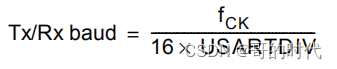 其中,fck为 USART 时钟, USARTDIV 是一个存放在波特率寄存器(USART_BRR)的一个无符号定点数。其中 DIV_Mantissa[11:0]位定义 USARTDIV 的整数部分,DIV_Fraction[3:0]位定义 USARTDIV 的小数部分。