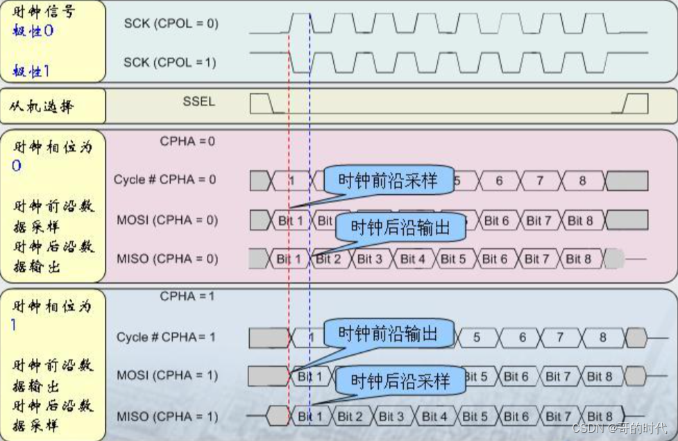 CPOL=0,CPHA=0:此时空闲态时,SCLK处于低电平,数据采样是在第1个边沿,也就是SCLK由低电平到高电平的跳变,所以数据采样是在上升沿,数据发送是在下降沿。