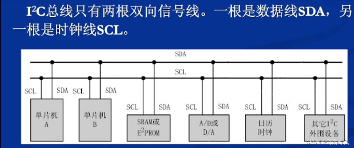 I2C总线是Philips公司在八十年代初推出的一种串行、半双工的总线,主要用于近距离、低速的芯片之间的通信;I2C总线有两根双向的信号线,一根数据线SDA用于收发数据,一根时钟线SCL用于通信双方时钟的同步;I2C总线硬件结构简单,简化了PCB布线,降低了系统成本,提高了系统可靠性,因此在各个领域得到了广泛应用。