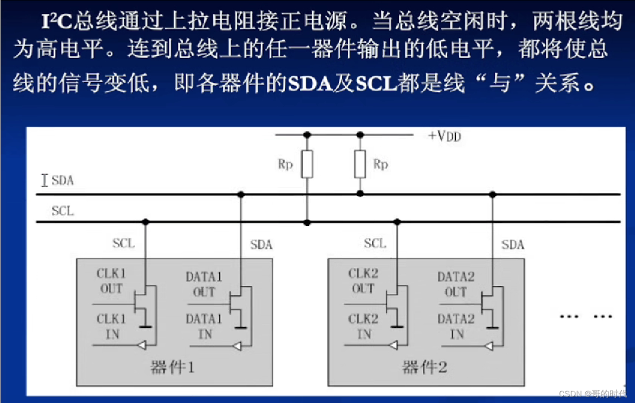 - 停止条件:当SCL是高电平时SDA线由低电平向高电平切换表示停止条件。