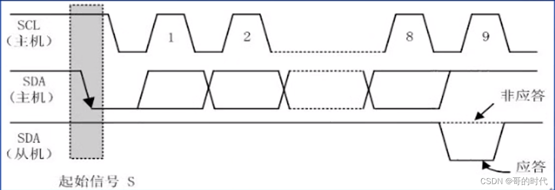 - 起始条件:在SCL线是高电平时SDA线从高电平向低电平切换这个情况表示起始条件。
