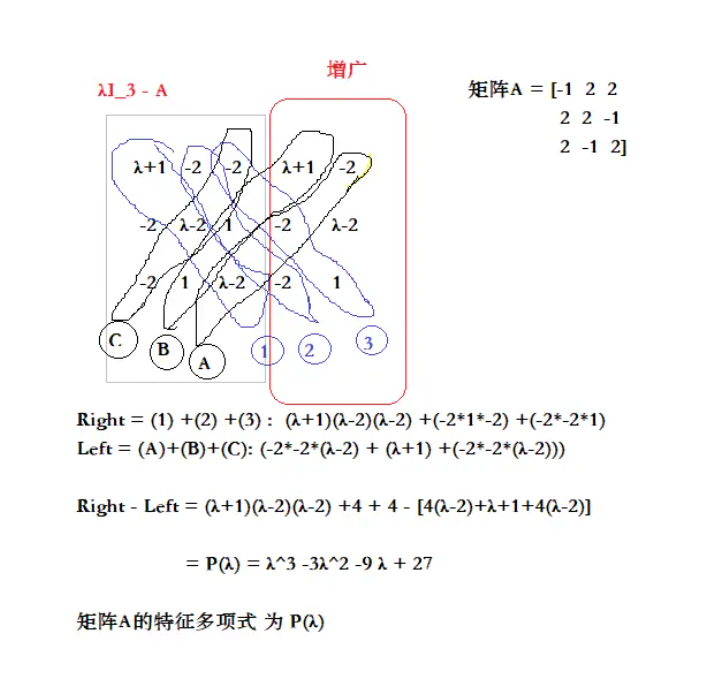 Right = (1) +(2) +(3) : (λ+1)(λ-2)(λ-2) +(-2*1*-2) +(-2*-2*1)