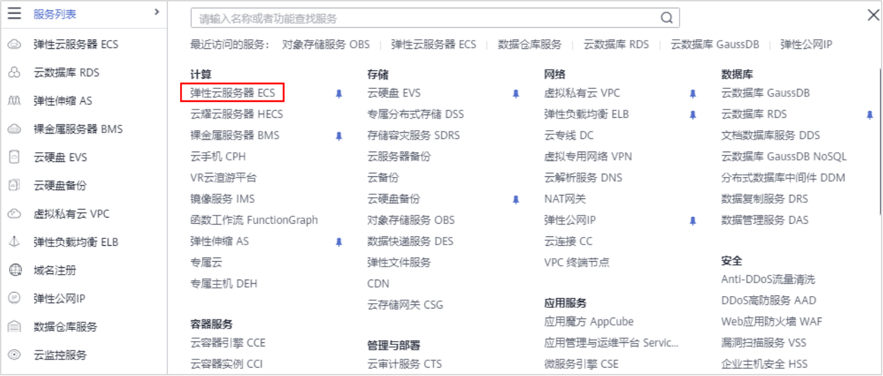 步骤 1 进入控制台,选择弹性云服务器ECS