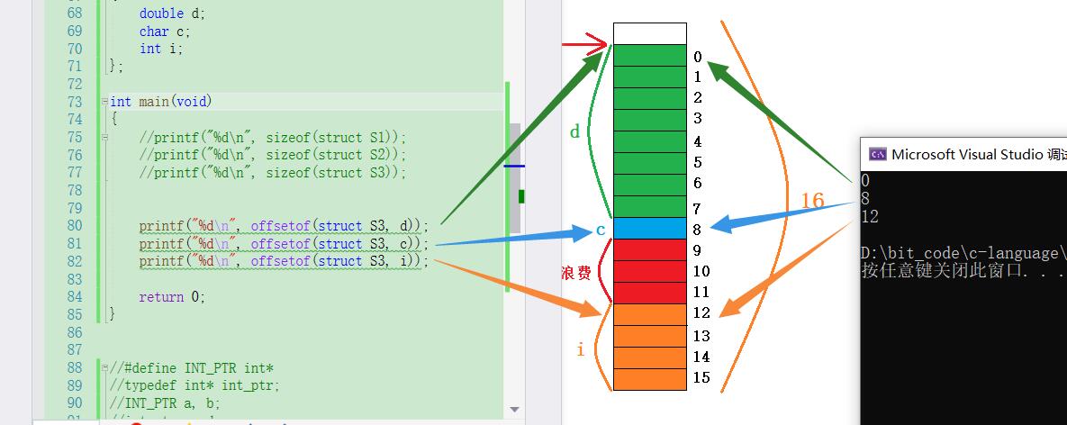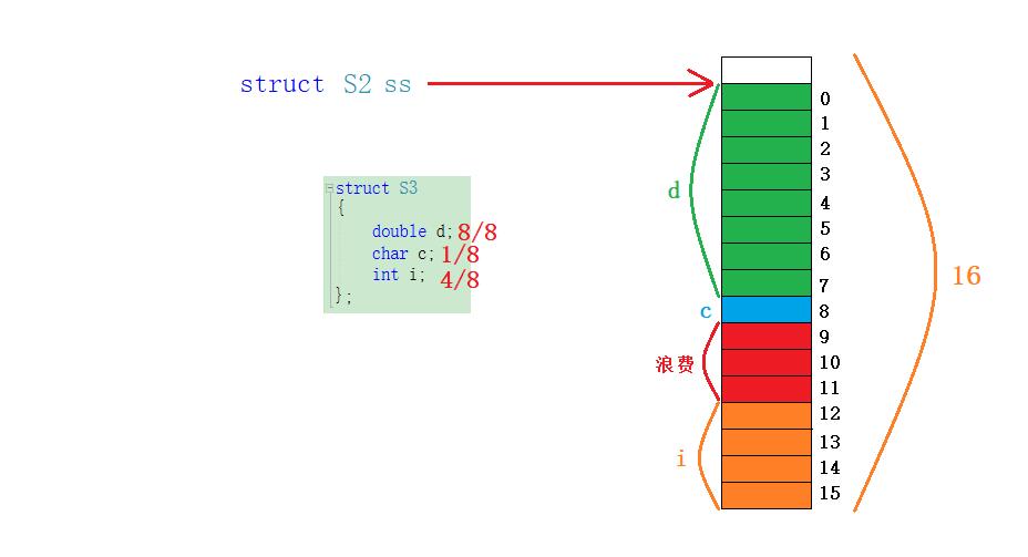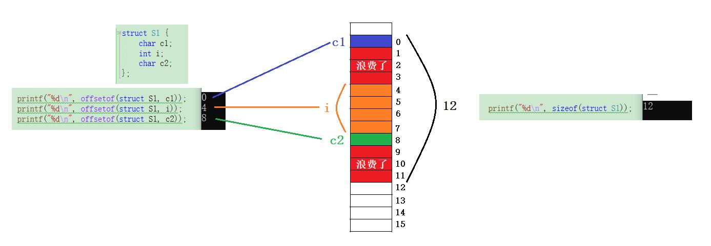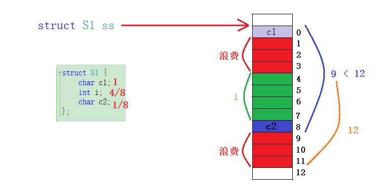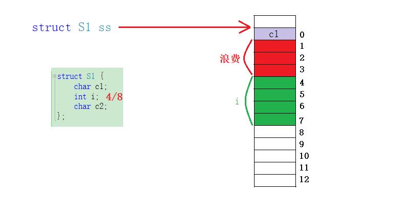 - 可以看出,因为总的结构体大小为12B,可是在放完这3个成员后中间空出了三个位置,并且对于最后在c放完之后还没有到达12B,所以还得再浪费3个空间的废位置