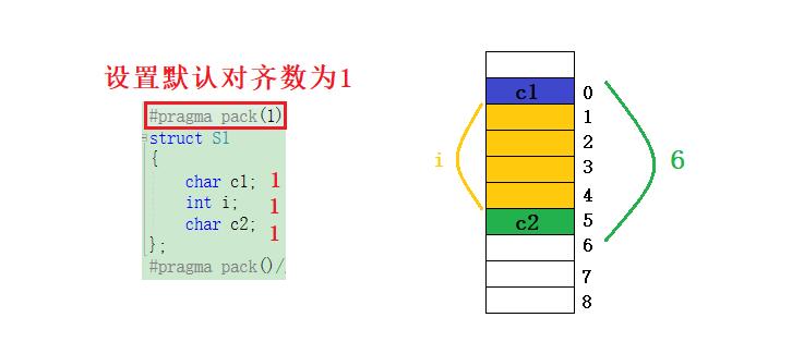 - 可以看到,若是默认的对齐数设置为1的话,那其实可以看出每个成员变量的对齐数就都是1了,那么也就不存在浪费的现象,因为任何数都是1的整数倍,所以3个成员变量的内存分布如下,大小即为【6】