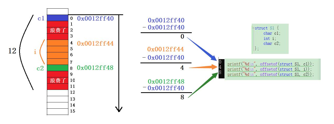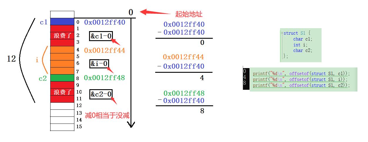 我们通过上面的结构体S1进行讲解。列出3个成员变量放置的初始地址,其实【offsetof】计算的也就是每个变量在内存中的起始地址相较于首地址偏移了多少,那将它们进行一个相减就可以得出