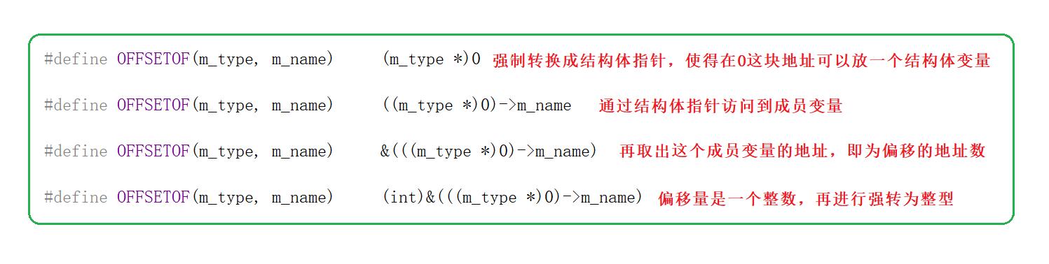 - [x] 首先是地址为0的这个地方要放置结构体成员,但是0是一个整型,所以我们使用强制类型转换将0转换成一个结构体的指针,那么在外部传入结构体成员变量的时候就符合类型了