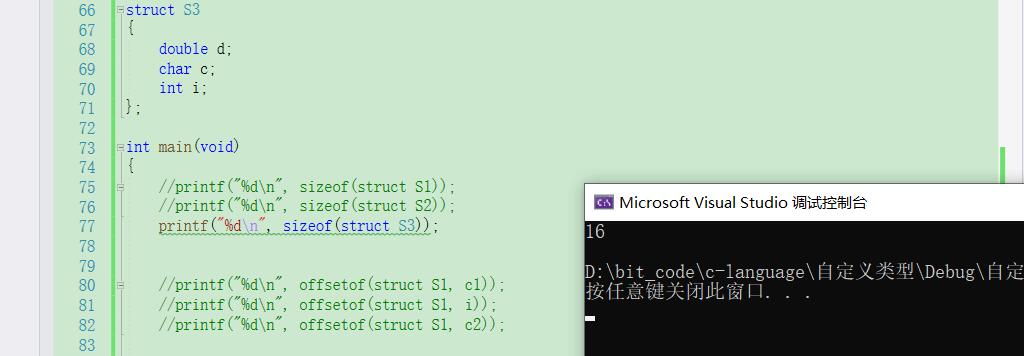 - 最后我们便去计算整个结构体的大小,为最大对齐数的整数倍,最大对齐数是8,计算一下放置三个成员变量占了16个空间,刚好是8的整数倍,因此16即为结构体的大小
