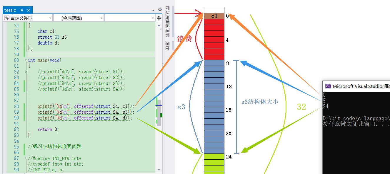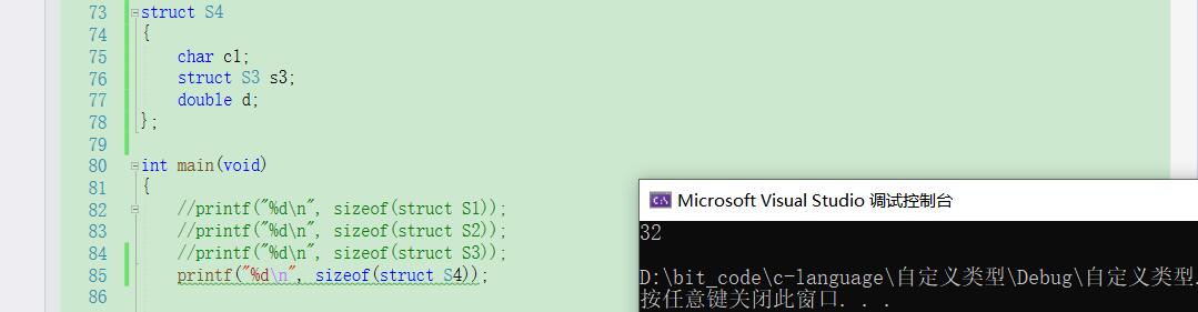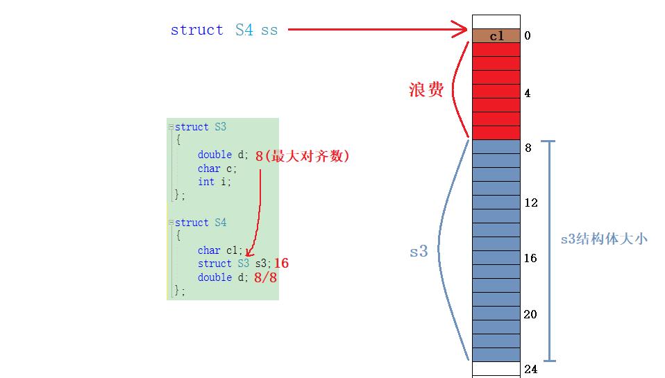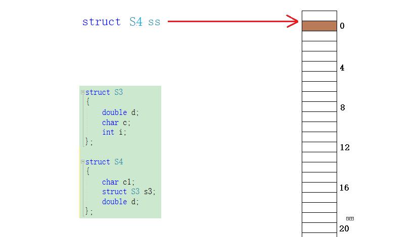 double类型的数据在内存中占8个字节,所以一直到31的地址处 - [x] 然后来算整个结构体s4的大小,为所有最大对齐数(含嵌套结构体的对齐数)的整数倍,也就是取s3和s4中的最大对齐数,那也就是【8】,计算一下结构体s4所占的内存空间为32,刚好为8的整数倍,所以整个结构体的大小即为32